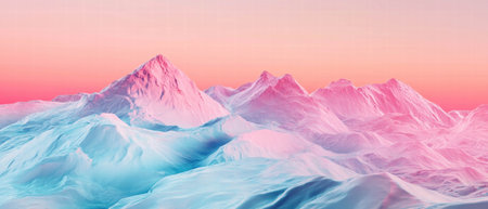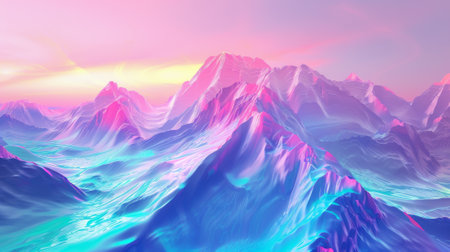 3D rendering. A pastel neon background with a colorful mountain backdrop. Fantasy wallpaper with terrain.