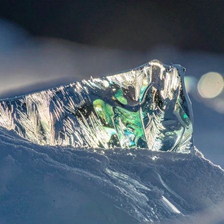 A shard of ancient ice, resting on a pristine bed of snow, catches the low winter sun.