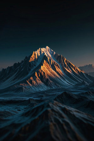 Snowy mountain peaks illuminated by twilight in a hyper-realistic painting style
