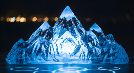 Ice cube in the form of a mountain at night, close-up