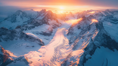 An idyllic sunrise in the Swiss Alps, featuring a beautiful aerial view of a snowy glacier