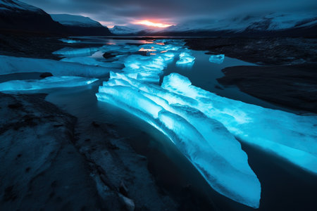 Glowing ice formations under a vibrant colorful sky at twilight.