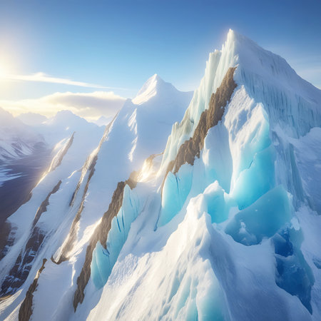 An intense aerial view of a snow-covered mountain ridge, featuring deep blue ice crevasses and sharp rocky outcrops. The sunlight dramatically illuminates the icy surfaces and snowdrifts, casting shadows that emphasize the rugged terrain. In the distance, more snow-capped peaks and a valley are visible under a bright blue sky with scattered clouds.