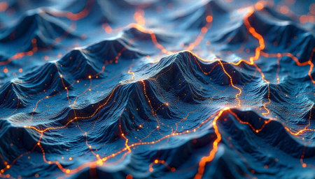 Abstract blue topography with glowing orange network lines