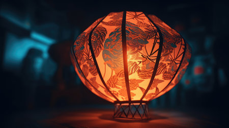 Intricately designed lantern with sacred symbols casts a warm glow, creating an atmosphere of mystery and spirituality in the evening