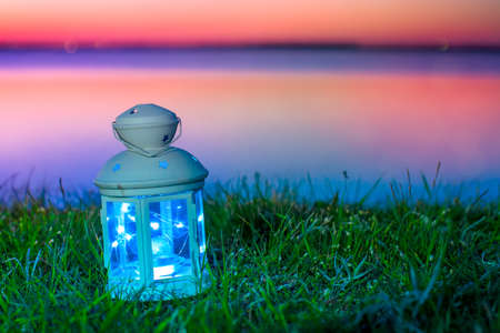 A lantern with lights stands in the green grass on the Bank of the river