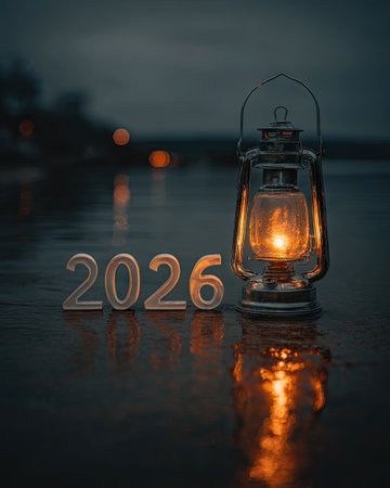A glowing lantern and the number 2026 are positioned on a reflective surface. The scene features warm light against a dark background, possibly outdoors during twilight. The composition emphasizes reflection and depth, creating a sense of mood. Suitable for various projects, including editorial or promotional material.
