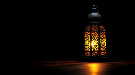 Arabic lantern with candle at night for Islamic holiday. Muslim holy month Ramadan. The end of Eid and Happy New Year. Copy space on dark background.