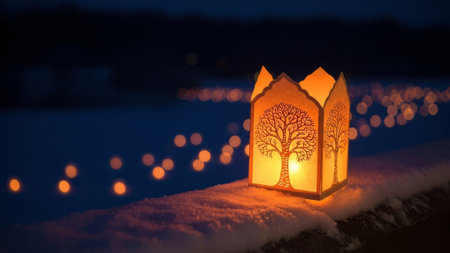 Paper lantern with tree, on snow, at dusk, with bokeh