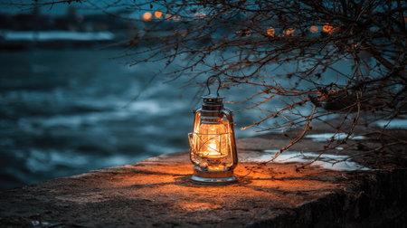 Old kerosene lantern with warm yellow light on a bridge by a lake in the evening. Burning lantern on a stone in the moonlight. The light of the sun reflecting the water through the lamp