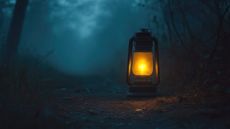 Creepy old lantern illuminating a path, foggy night, copy space