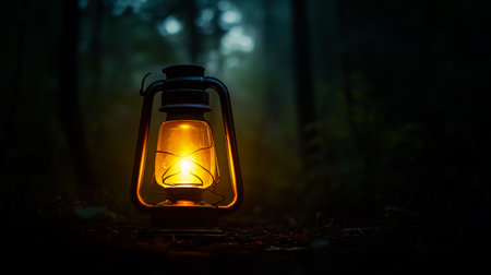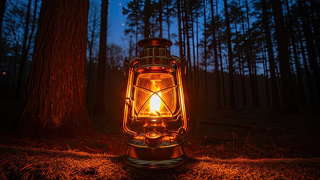 A glowing lantern illuminates a dark forest, casting warm light on surrounding foliage. The image showcases a vintage-style lamp with a bright flame, creating a contrast between the light and the shadows. This photograph could be used for illustrating concepts such as exploration, adventure, or ambiance.
