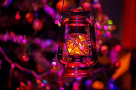 Vintage kerosene lantern Christmas night and bright blurred beautiful background with bokeh. Soft focus.