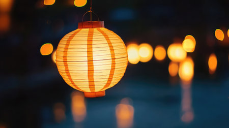 A beautifully lit paper lantern hanging elegantly in a peaceful evening environment, accentuated by soft reflections on the water and glowing bokeh lights.