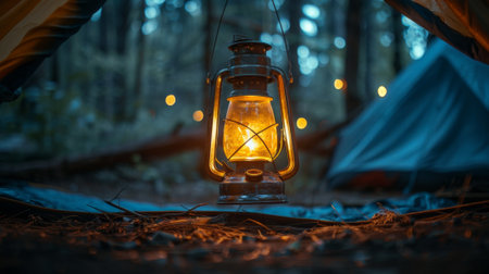 illuminated lantern inside tent at night, representing camping in the great outdoors