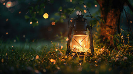 Lantern glowing in lush, magical forest setting at dusk with fireflies