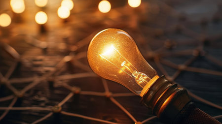 Glowing light bulb illuminates dark background, creating warm and inviting atmosphere. intricate web of lines adds depth and texture, enhancing overall aesthetic appeal