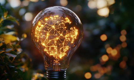 Glowing network inside lightbulb, garden bokeh background. Idea concept
