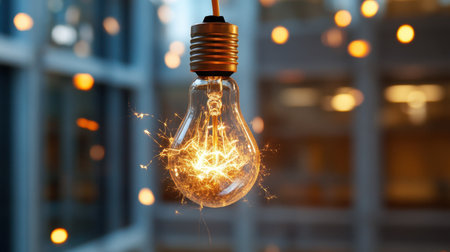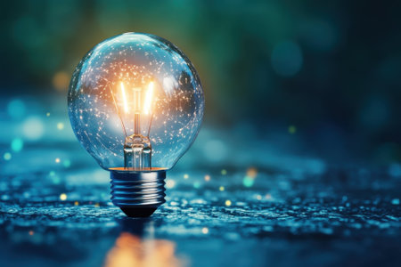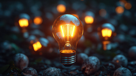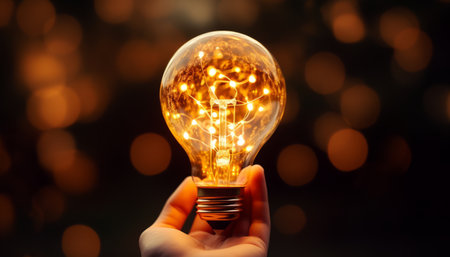 A stunning close-up of a light bulb with a sparkling filament, suspended in a softly blurred environment. The warm glow creates an inviting atmosphere.
