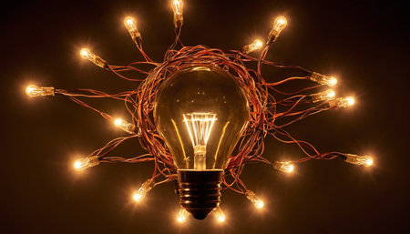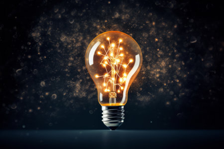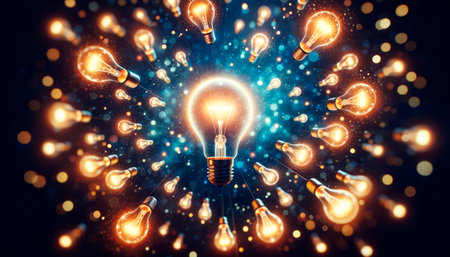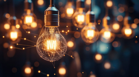 Interconnected, illuminated light bulbs against a dark backdrop, showcasing the transformative power of innovative ideas in business