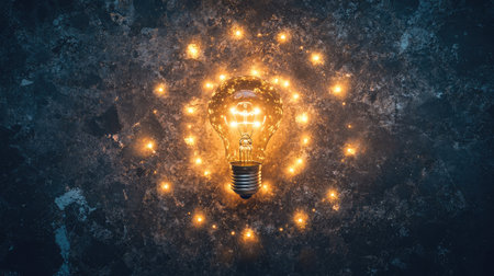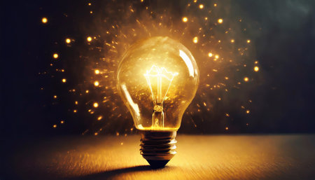 A single lightbulb shines brightly, surrounded by a flurry of golden bokeh.