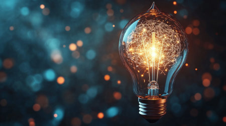 Close-up of an illuminated light bulb against a dark bokeh background, symbolizing ideas and creativity. Ideal for themes related to innovation, technology, and inspiration.