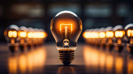 Close-up of a glowing light bulb with a warm orange bokeh background, symbolizing ideas, creativity, and inspiration.