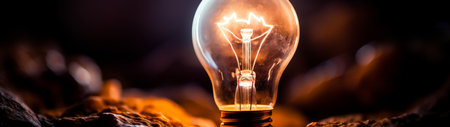 A warm glowing filament light bulb in focus with a dark bokeh background, symbolizing bright ideas, inspiration, and energy.