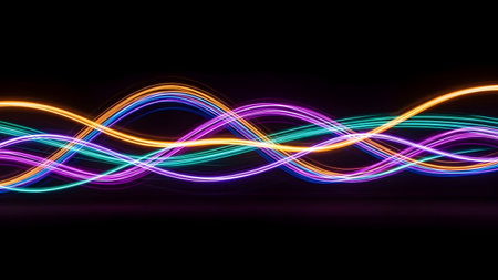 A horizontal wave of colorful neon light trails in orange blue and pink moves smoothly across a dark background.