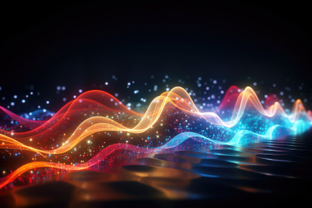 Dynamic showing colorful neon waves with glittering particles reflected on a dark surface keywords: abstract,...