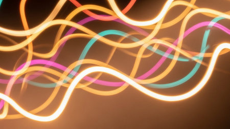 Dynamic glowing neon light trails create an energetic abstract pattern across a dark background. Multiple colorful wavy lines in orange, purple, blue, and green intertwine, symbolizing connectivity and data flow. This visually striking image is perfect for technology, communication, or modern art concepts.