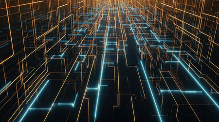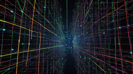 Tech showing intricate network of glowing neon lines in blue orange and green forming a complex geometric grid pattern on a dark background representing data or...