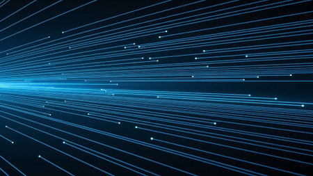 This image presents an abstract representation of data flow, featuring vibrant, glowing lines against a dark background. The composition showcases dynamic movement with a perspective focus, utilizing bright blues, greens, and purples. It suggests a technological or scientific concept and could be utilized for various commercial purposes.