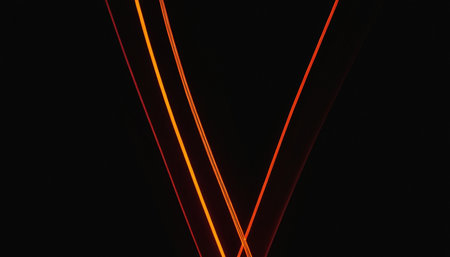A vibrant streak of fiery orange light cuts through the darkness, captured in a long exposure shot against the cool, steady glow of an industrial fluorescent lamp.