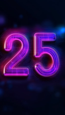 Vibrant Neon Number 25, Illuminated Against a Dark, Abstract Background with a Futuristic Aesthetic