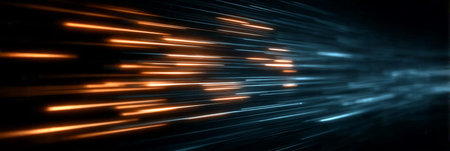 An abstract digital illustration showcases a dynamic flow of light trails. The artwork features streaks of blue, red, and white against a black backdrop, suggesting high-speed data transfer. The composition has an immersive perspective. This imagery is suitable for technological and scientific projects.