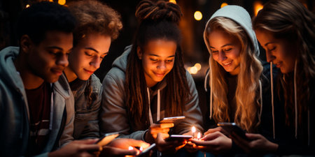 Depicts multicultural young people using mobile phones in a social setting. Implies addiction to new technologies among teenagers. Shows the prevalence of mobile phone use among young people.