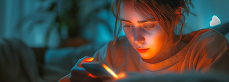 A sad person checks their smartphone at night. A woman scrolls through social media on her phone screen. Adults suffer from internet addiction.
