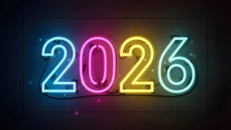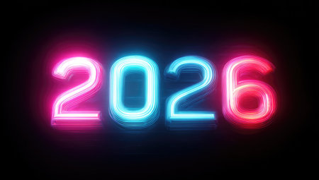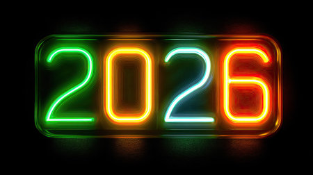 Bright neon numbers representing year 2026 glow against dark background, creating modern and vibrant atmosphere. This symbolizes future and new beginnings