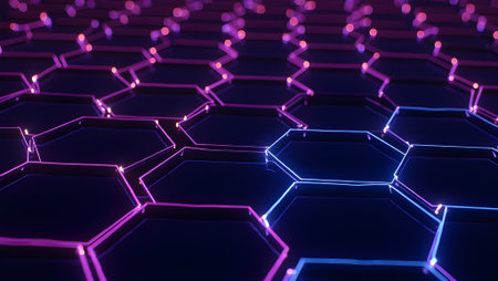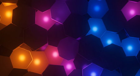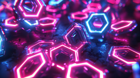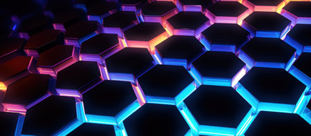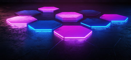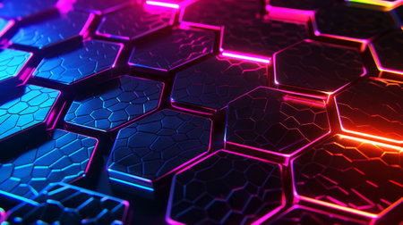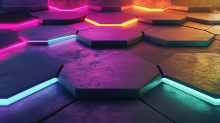 Vibrant hexagonal tiles illuminated with neon lights in a futuristic setting at night, creating a visually striking atmosphere. Generative AI