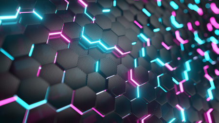 A neon background with a repeating pattern of glowing hexagons in neon blue and purple, creating a high-tech and futuristic feel.