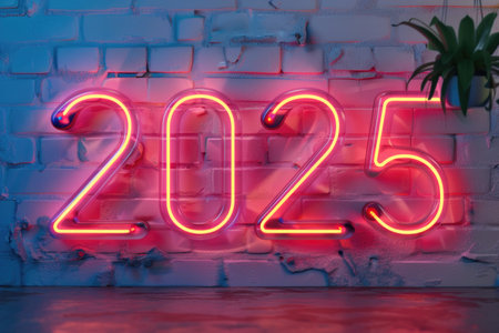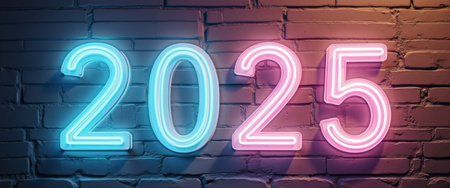The vibrant neon numbers 2025 shine brightly in electric blue and pink hues, set against a rustic brick wall. This striking image captures the excitement and anticipation of the New Year, inviting viewers to celebrate fresh beginnings and new adventures.