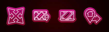 Set line Road traffic sign, City map navigation, and Location with house. Glowing neon icon. Vector
