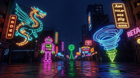 A futuristic city street at night is illuminated by vibrant neon signs depicting a dragon, robot, and tornado, with wet reflections on the ground.