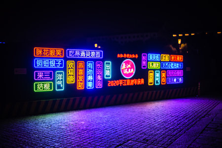 Vibrant neon signs illuminate bustling corridor in urban space
