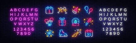 Big collectin New Year neon signs. Happy New Year Neon Icons Vector. Merry Christmas icons lights design template, modern trend design, night light signboard. Vector. Editing text neon sign.