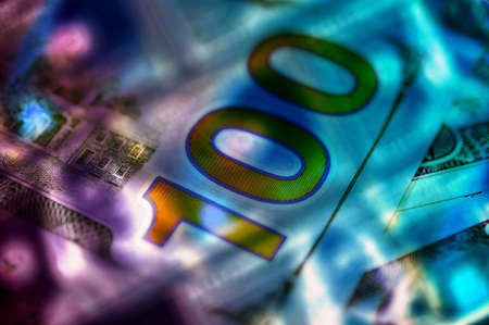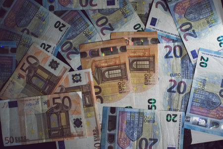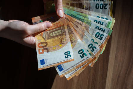 Selective focus on detail of EURO banknotes. Counting or giving EURO banknotes. World money concept, inflation and economy concept