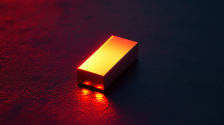 A visually striking rectangular object emits a warm glow against a dark surface, showcasing rich textures and a captivating play of light and shadows.