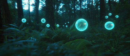 Floating magical orbs illuminate a mystical forest at twilight in an enchanting sight