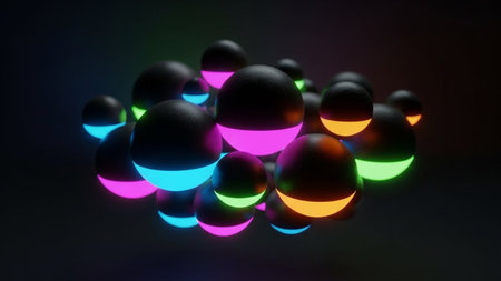 3d rendering of abstract spheres with colorful lights on dark background.